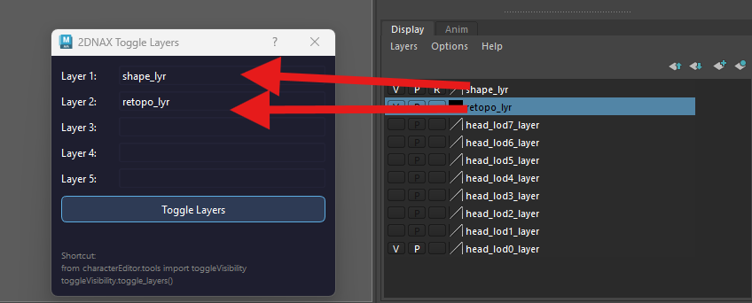 - In order to use Toggle_Visibility you need to choose layers you want and input their names. You have fields for 5 layers’ names. By pressing the Toggle Layers button, you can now toggle between them by pressing ` shortcut on the keyboard.