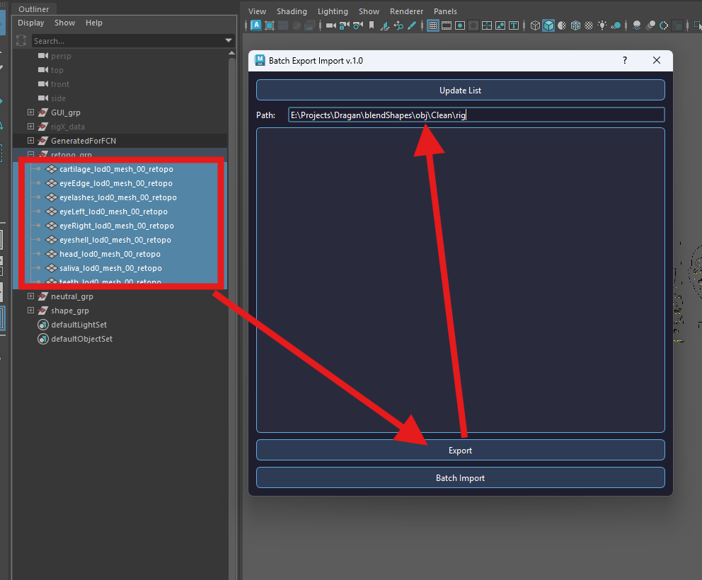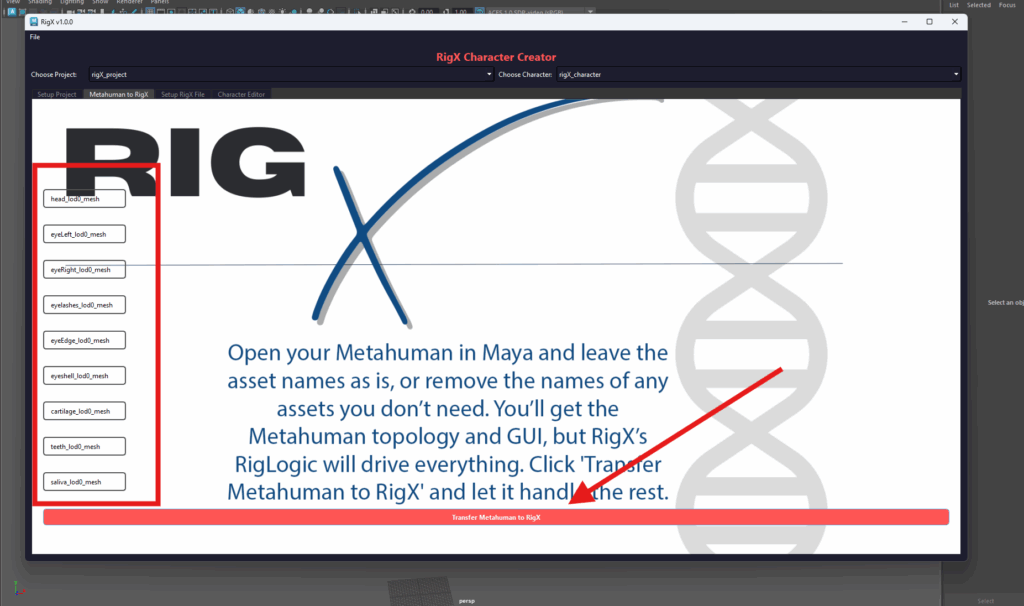 Open any rigged Metahuman in Maya (any version of metahuman) and select the project and character you want to transfer it to. On the left side of the tool, you will see properly named assets that come with the Metahuman LOD0 head. If you do not need some of these assets, simply remove the name from the bar and leave it empty.