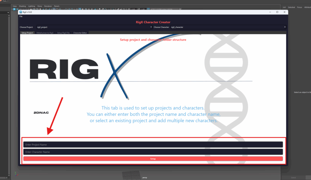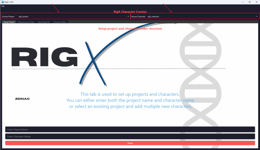 To create a new project, enter the desired Project Name and Character Name, then click the Setup button.