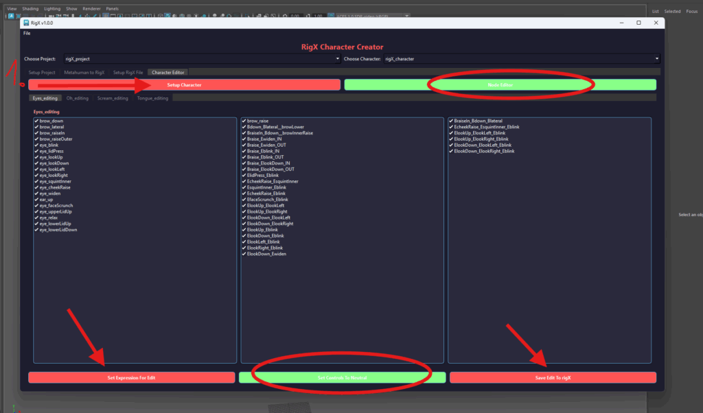 The Calculate RigX File function will take into account the expressions you have selected. Once the calculation is complete and the files are generated, click the Calculate RigX button to create a fully working character in Maya.